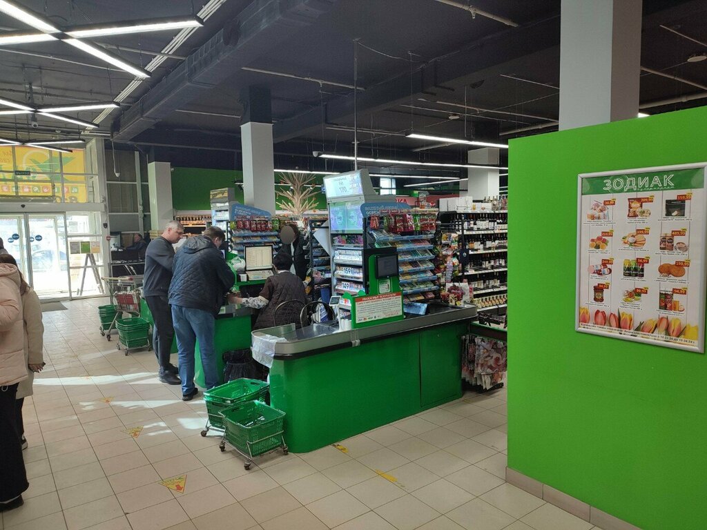 Главное преимущество Зодиака- его шикарный ассортимент, доступность транспортная- прямо на пл. Свободы и временная- работает круглосуточно.. Возвращаясь домой хоть заполночь- будет накормлен и напоен.. Для пенсионеров скидки существенные по Заботе.. Локация продуктов разумная.. Мне нравится..