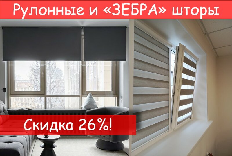 Современные окна заслуживают современных решений. Представляем: скидка —26% на рулонные шторы и «Зебра» (день-ночь) — идеальное сочетание ф...