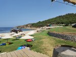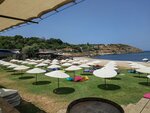 Entrance is paid. A very pleasant lawn under umbrellas. They give ottomans. The restaurant is good, the price tag is high. The beach is sandy with an admixture of pebbles. There is a pantone platform to jump into the water. The beach is in the bay, the water is warm.