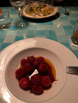 So, you buy a menu either with a set of Dishes for more than 4 lire per person, or there is a menu with only 3 salads, 3 appetizers and 3 hot dishes and the cost is above average, water costs 75 lire, the waiters did not remove empty plates on time, they gave only 2 paper napkins, the appliances did not change, and they left the ones they ate with, for which I don't understand 1 percent in the tip checks, I would have left less, but this place is authentic with dimmed lights and only