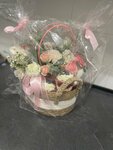 Нежная композиция в корзинке из роз, эустомы, гвоздики и гиперикума