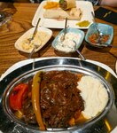 Решили заглянуть на обед, в целом хорошо, но есть некоторые моменты. Искандер очень вкусный, сочный, но на мой взгляд сюзьма слишком кислая и под мясом лучше были бы куски лепешки, чем сухарики. Мезе вкусные, особенно абагануш. И наверное самый главный вопрос, почему у вас "традиционный турецкий" чай подаётся в обычном чайнике а не в двойном? К тому же переборщили с заваркой и чай откровенно горчил. В Турции такого себе не позволяют 😁. А, ну и ценник видимо сделан с учётом инфляции на 2 года вперед