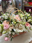 Корзина, оазис, георгин 3 шт., гвоздика - 7 шт., роза - 3 шт., лагурус 1 шт., бересклей 2 шт.