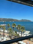 A normal city hotel. We rested here in September for 10 days. Our ROOM had a direct sea view for two people – newly renovated, small, little storage space, excellent plumbing – there were no problems with pressure during rush hour. There are no dental supplies, razors, or lab coats. One pair of slippers for the entire stay, and mini-formats of shower gel and hair conditioner are periodically reported. The full–size shampoo is bolted in the shower, the liquid soap is near the washbasin. SAFE DEPOSIT BOX for a fee – 3 euros/day (September 2025). CLEANING is mediocre, but regular. Towels were changed every day, bed linen was changed several times and cotton pads and sticks were periodically checked. THE FOOD is normal. I wasn't particularly impressed, but we weren't hungry either. From fruits: delicious watermelon, melon, peaches, apples, grapes. Different types of cheeses. Desserts are mostly not very tasty (which is just as well). The dishes are a little under-salted, but there is salt and seasonings in the hall. For lunch, it is better to go right to the very beginning of the meal, otherwise it will be difficult to find a seat. THE BEACH is small and congested. The sun beds are located extremely close to each other. The most advantageous places are on the pier, but they are actually occupied from 5 a.m. – one person comes and lays towels on 5-6 sun beds, whose users often appear only at lunch or later. A hotel employee was seen laying towels on the sun beds in the early morning, apparently for a tip. The entrance to the sea is on small pebbles, there is a risk of injuring your feet. There are biting fish in the sea – it's better not to stand still. The CONTINGENT consists mainly of pensioners from the UK and Poland. They smoke a lot, so cigarette smoke is everywhere. There are no children. There are a lot of cats. The STAFF is friendly and diligent, very courteous to the older generation. noisily. Marmaris is a city of bars and hangouts. Despite the fact that the music in the hotel itself stops at exactly 23:00, loud sounds from the street will be heard until one o'clock in the morning. Closed windows can solve the problem, but in this case you will have to sleep with the air conditioner on. THE LOCATION is excellent – in one direction along the promenade along the sea is the bustling center of Marmaris, in the other – a quieter embankment (if you go a little further, you get almost into a coniferous forest). There are many shops, supermarkets, bars/restaurants around.