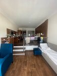 1. The entrance to the sea is through a concrete pier on which there are hedgehogs, but then the sand is very cool and golden. (Holidays with children from 10 years old) descent to the sea by shuttle. You can walk by yourself, but up the stairs. 2. The animation is simply gorgeous for 100 points, everything is constantly interesting and fun for small children, everything is provided and adults do not lag behind. 3. The food is simply gorgeous, even with shrimps and squid. The choice of dishes is off the scale. 4. 2 swimming pools for children and for everyone else. 5. Everything is provided for people with disabilities. 6. The Europeans and Turks do not know Russian here (and for us it is super). 7. A huge plus of this hotel is the Wi-fi throughout the hotel is working and perfect. Even in the bungalow there are slides (although there are no photos from there, they did not take the phone)