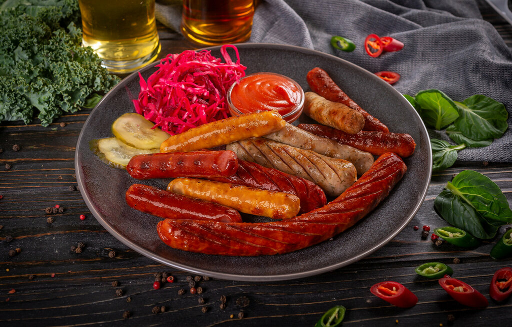 В сет входит 4 вида колбасок, изготовленных по оригинальным немецким рецептам. Подается с капустным салатом, маринованными огурцами и соусом