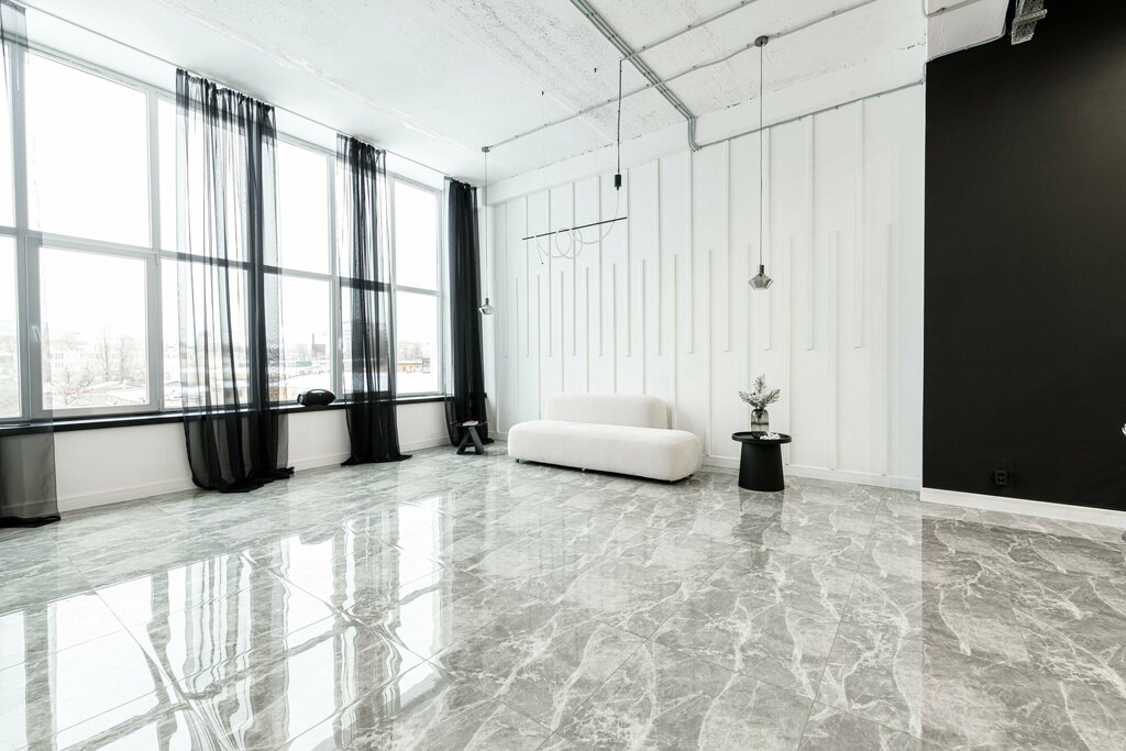 Зал выполнен в минимализме. Особенности керамическая плитка, Которая сочетается с черной и белой стеной. А также есть локации с имитацией бетонной плиты. Идеально подойдет под свадебные и персональные съемки, под съемку контента для магазинов и ли...