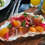 Очень вкусный салат из хрустящих помидоров ,хинкали с рыбой. Рекомендую. Отзывчивый и вежливый персонал. Домашние сыры-очень даже ничего☺️