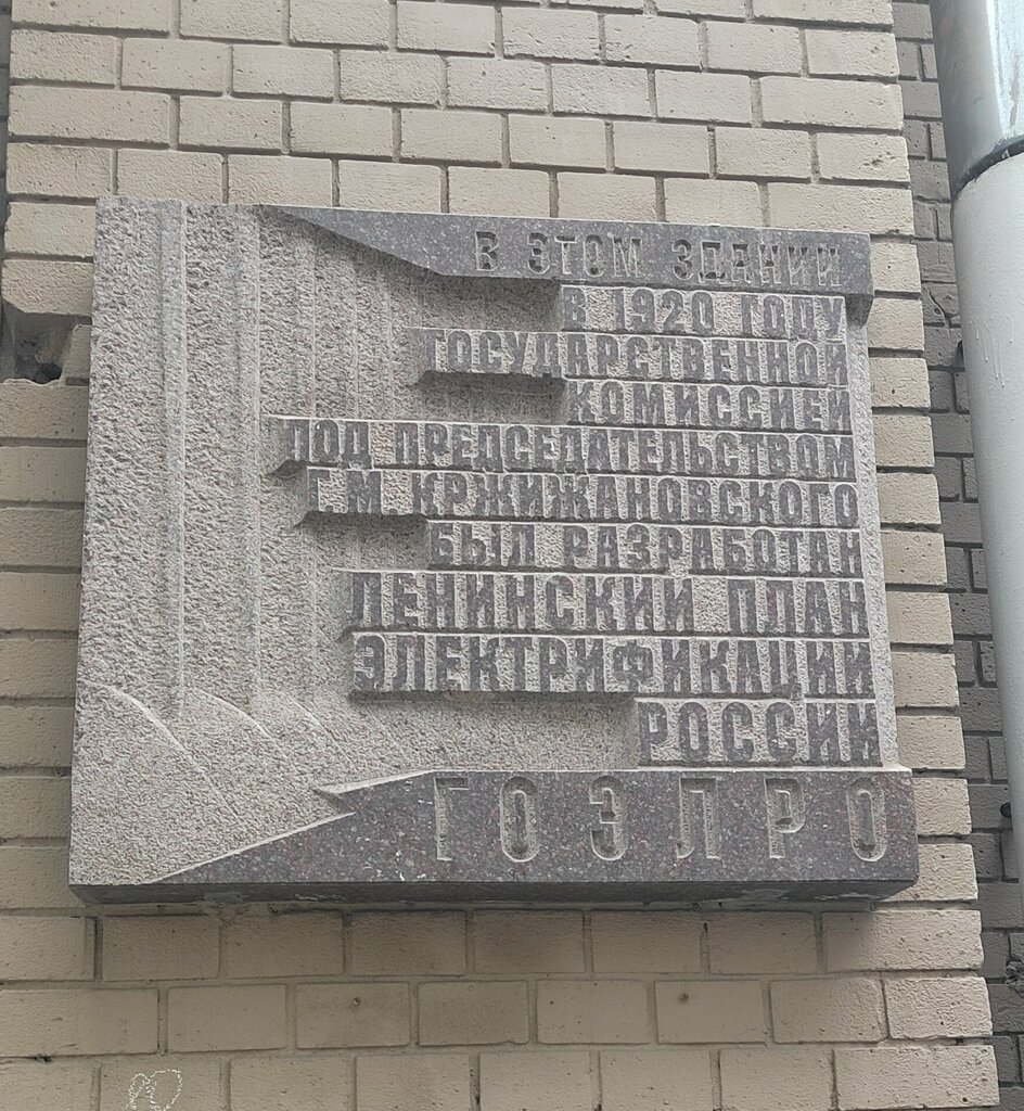 Memorial plaque, foundation stone В этом здании в 1920 году государственной комиссией под председательством Г.М. Кржижановского был разработан ленинский план электрификации России ГОЭЛРО, Moscow, photo