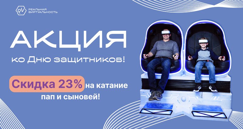 Дарим скидку 23% на VR-приключения нашим защитникам! С 20.02 по 23.02 действует праздничная акция: минус 23% на аттракционы для пап и сынов...
