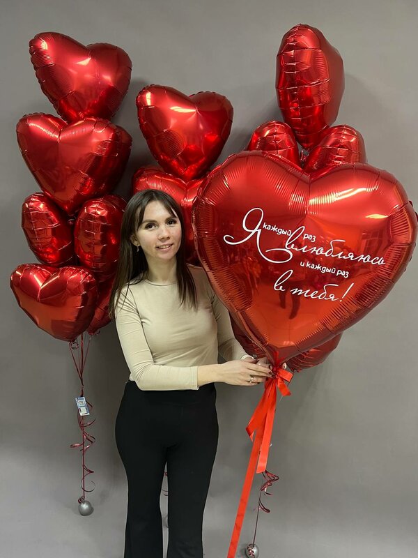 В наборе 3 стойки, в каждой по 10 фольгированных сердец+ большое фольгированное сердце с изготовлением вашей надписи на нем