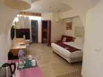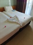 I am leaving the hotel today (20.10). First of all , the staff is very friendly ! Upon arrival at the reception , I voiced my wishes for the room , but I still came to celebrate the anniversary . 😁 The room was given to a family , with a large terrace , a bed and a view of the sea . 🌊 ( without extra charges ) just the royal chambers for me ) The food is quite varied, the hotel is very full, so it's better to come either to the beginning or to the end of the meal. Entering the sea on the soft sand is perfect! There would be enough sun beds if the vacationers did not get impudent and did not occupy them early, but would probably come at closing time) at the moment I am on the beach (the third hour as) and I observe the sun beds occupied by towels without people. There are a lot of Russians , a lot of our music . According to my feelings, more than all pensioners, young people will be bored if they do not like silence and a measured seal vacation Personally , I really liked the hotel ( The hotel is not new ! If they renovate, there will be no price for it.)