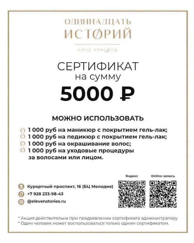 Прекрасное место! Замечательные мастера!! Елена-супер стилист по волосам! Все ваши пожелания , будут воплощены . Марина-мастер маникюра. Всегда идеально, быстро, качественно! Очаровательный администратор Юлия!! Приветливая , улыбчивая и очень грамотная в коммуникации. Всем советую, если вы ищите спокойное , стильное место-то вам обязательно нужно посетить клуб красоты «11 историй»