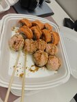 Очень посредственные суши по цене хороших. Филадельфия представляет из себя комок риса с кучей сыра и полежавшей рыбой, несмотря на размер этого кулинарного шедевра, весь вкус перебивается килограммом огурцов. Запечённый ролл наврядли был в духовке, шапка сверху это просто горстка майонеза без каких либо признаков термообработки. В комплектации нет ни соуса, ни васаби, ни имбиря. При этом "горячие" роллы зачем-то облиты соусом. Доставка заняла почти два часа, кусочек фольги намотанный на упаковку запечённых роллов позволил улыбнуться, но точно не доставить их хоть немного тёплыми. Рекомендую обходить это место стороной.
