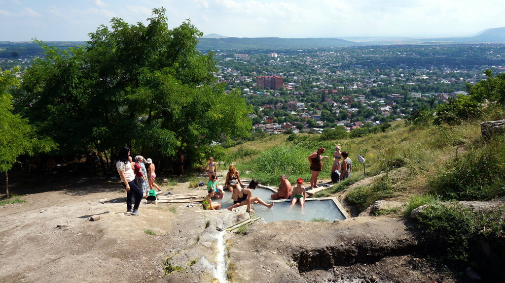 Очень душевное место. Природный выход термальных вод на поверхность. Организованы 4 небольшие купальни каскадом. Не глубокие. В самой верхней максимальная температура градусов 50-55-60 (у источника). Во второй купальне около 40. В самой нижней на уровне 20. Большинство посетителей принимают недолгую водную процедуру в 3 и 4 купальне. Более теплолюбивые во 2 сверху. Только самые стойкие погружаются в самую верхнюю, либо греют ножки. Сразу в верхнюю погрузиться не смог (горячо), но полежав во второй минут пять, сделал второй удачный подход. Минут 10 полежать можно. Расслабляет. Днём в зной, наверное, труднее долго тут находиться. Я встречал рассвет в 04.30 греясь в купальне и любуясь видом на Эльбрус вдали. Место слабо оборудовано. Есть скамеечки и досочки на которых можно сидеть. И часы для контроля времени