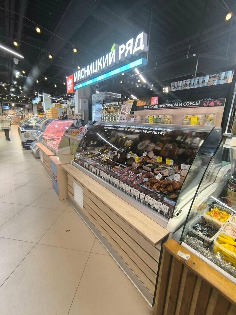 Очень люблю этот магазинчик и вообще продукцию Мясницкой ряд, копчёные куриные крылышки, окорок, сырокопченые колбасы, блинчики с мясом. Каждый день что-то по акции по карте. В отделе работает очень приятная, любезная женщина, всегда всё расскажет, покажет! Благодарю за продукцию и сервис!