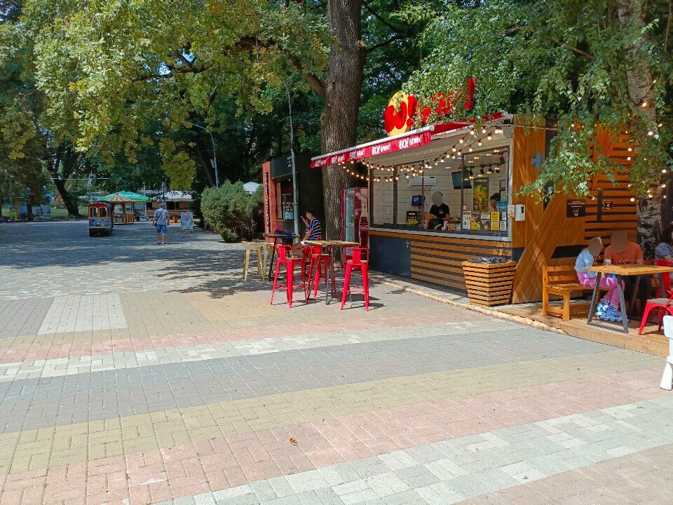 Гуляли с сыном в парке , решили перекусить Взяли блинчики Цезарь : сам блин мягкий, прожаренный. Начинки много , вкусный соус . Кофе не плохой, брала капучино. Девушки работают приветливые . Были утром в будний день, людей мало, поэтому ожидание быстрое . Хорошее место для перекуса , советую