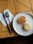 3 штучки творожных сырников, дополнительно к которым можно попросить на выбор джем, сгущенку или греческий йогурт.