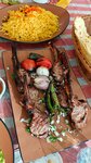 We ordered rice and mutton. Mutton (square on the bones) is unreal. It 's very tasty . The rice is great. To top it all off, they brought us 5 sauces, 2 salads, 2 soups (we didn't eat the soup), a hot flatbread, 2 bottles of water, and 2 teas. We ate everything, packed half of the rice with us. Since my little aunt and I are traveling , we 'll heat up the rice and eat it in the evening .