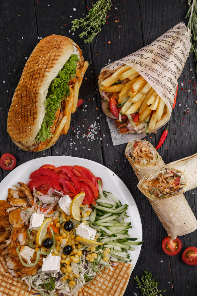 Фирменная ржаная или пшеничная лепешка, курица, фри, помидоры, огурцы, микс капусты, три соуса.