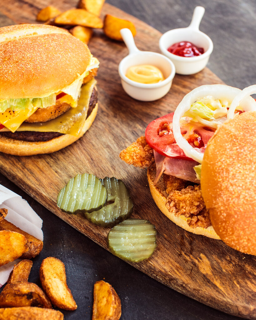 Булка большая, соус медово-горчичный, лук красный, огурец соленый, сыр, 2 большие котлеты говяжьи, свежий помидор, салат Айсберг. Выход готового продукта: 340 гр