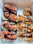 Лосось, тунец, соус для запекания (майонез, икра тобико микс, сыр Пармезан), соус Унаги, кунжут, рис, нори