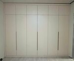 Ребята сделали мне гардеробную мечты. Подобрали с дизайнером небанальный оттенок белого матового покрытие, благодаря которому материал смотрится дороже, чем обошелся по факту. Кроме того, из-за кривого потолка в нашем доме пришлось на заказ изготавливать детали, чтобы визуально всё смотрелось ровно. Всё подогнали до состояния близкого к идеалу