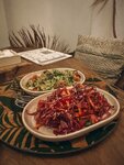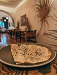 Vegetarian/vegan restaurant in Baku! A cozy place with an ethnic interior and delicious vegetarian and vegan interpretations of familiar dishes. And, of course, don't forget that you don't have to be a vegetarian to enjoy delicious vegetarian food. Don't miss the opportunity to try delicious dishes! 🤏🏻 The serving of the dishes is a little delayed There is one table on a small balcony with a beautiful view of the street – Risotto with mushrooms (9 ₼) – pleasant texture, balanced combination of spices and ingredients, perfectly cooked. – Salad with guacamole (9 ₼) – guacamole is saturated, avocado is cut into strips, which gives the dish more texture, you can eat as an independent dish. There are a lot of onions in the sauce. – 🫓 Kutabs: with greens, pumpkin and soy meat (5 ₼) – an assortment of three types of kutabs. Usually in Baku, kutab with pumpkin is sweet, but here the filling is spicy, which adds piquancy. Unlike other establishments, the dough is less greasy, rather crispy and dry. Kutabs with soy meat and herbs are also crispy and dry. – 🥬 Red cabbage salad (6.5 ₼) – resembles vitamin salads from childhood. It goes well with risotto. It is not worth ordering as an independent dish, it is better as an addition. Fried potatoes with mushrooms (9 ₼) – juicy, perfectly cooked potatoes with mushrooms. – 🥤 Lemonades (6 ₼) – red basil and berry lemonade. Refreshing, but expected a less sweet taste.