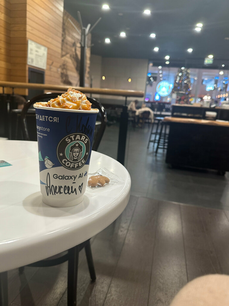 Я очень люблю посещать Stars Coffee. Атмосфера там уютная и располагающая к отдыху, а кофе всегда радует своим насыщенным вкусом и ароматом. Обслуживание быстрое и дружелюбное, что делает каждое посещение приятным. Особенно нравится свежая выпечка, которая идеально дополняет любой заказ. Место отлично подходит для встречи с друзьями или для работы в приятной обстановке.
