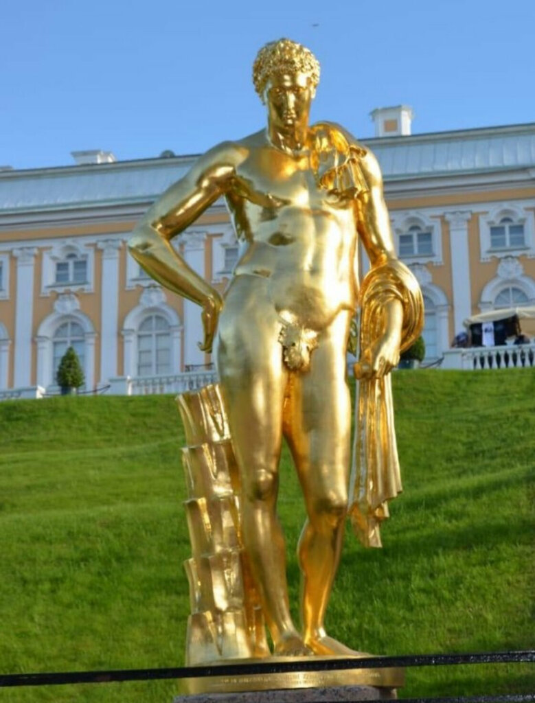 Скульптура Мелеагра Бельведерского установлена на Большой каскад в Нижнем парке Петергофа. Позолоченная бронзовая статуя изображает героя древнегреческой мифологии Мелеагра - участника похода аргонавтов и калидонской охоты, является золоченной копией с античного оригинала IV века до н. э. Не проходите мимо...
