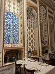 The restaurant is located in the courtyard of the Lyabi House Hotel. Geographically, it is located in the very center of the old town. The stunning atmosphere of the dinner is set by the ancient architecture: a terrace, columns, a carved ceiling, murals on the walls. The foreign guests liked the menu and bar list very much, and during their 4-day stay in Bukhara they were asked to arrange a repeat dinner there. Everything is very tasty and varied, the freshest greens and a beautiful presentation. You need to book in advance, during the season there are many not only tourists, but also locals in the restaurant.