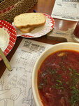 «Как Столовая #1. Дороже, но так же вкусно». Ещё одно заведение на новом Арбате, которое свои атмосферным интерьером хочет погрузить вас во времена прошлого СССР: обои, инсталляции, старые фотографии, фильмы тех времён что крутят по телевизорам на стенах, нетипичные таблички для стола «Резерв» в виде банки тушёнки, антресоли с книгами, девушки-официанты в красивых платьях и юноши в опрятных рубашках. И конечно же еда. От меню ожидал правда такого же советского на выбор, но запивать вареники бокалом мохито - тоже пойдёт. Меню от этого не пестрит изобилием видов вареников, чего ожидаешь от соответствующего названия заведения, но выбрать действительно есть из чего. Правда вареники что я заказал, принесли слипшимися, но - это наверное я давно не ел такого и это их обычная среда обитания в горшочке. В общем вкусно, красиво, но - не так и бюджетно - за суп, вареники и лимонад вышло 1325 р. Идентичная «Столовая #1» имеет те же позиции, и в раза в три дешевле можно поесть. Но зашёл бы я сюда ещё раз - скорее всего.