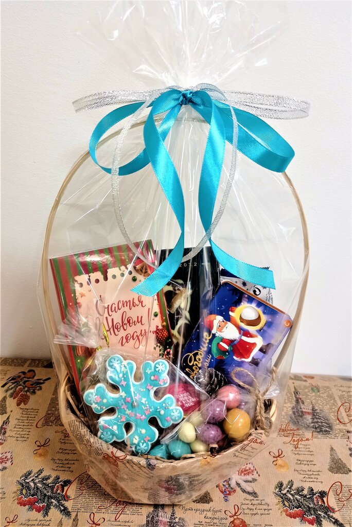 Подарочная корзина на Новый год со сладостями.