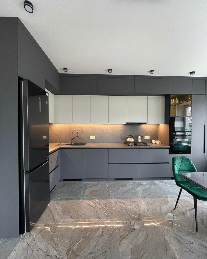 Обзор кухни в ЖК «Новая Самара» Используемые материалы: Фасад: Мдф AGT Supromat + Лдсп Egger Столешница из терма влагостойкого пластика Egger, толщиной 38мм, цвет Сланец Юрский антрацит. Фурнитура Blum c доводчиками (Австрия) Ручки Gola про...
