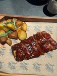 Свиные ребра, соус барбекю, фисташки, апельсиновая цедра, соус кисло-сладкий, медовый терияки, лук зеленый, картофель стоун