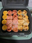 Запеченная Аляска с креветкой, запеченный Гранд с мидиями, запеченный Гранд с курицей, Калифорния в икре, маки с огурцом, маки с тунцом. Подается с соевым соусом (30 г), имбирём (30 г), васаби (10 г)
