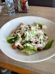 We had caesar salad and pepperoni pizza. Caesar is terrible, doused with mayonnaise, there was no cherry. But I really liked the pizza, and the cafe gave me four points for it. The prices for this city are reasonable.