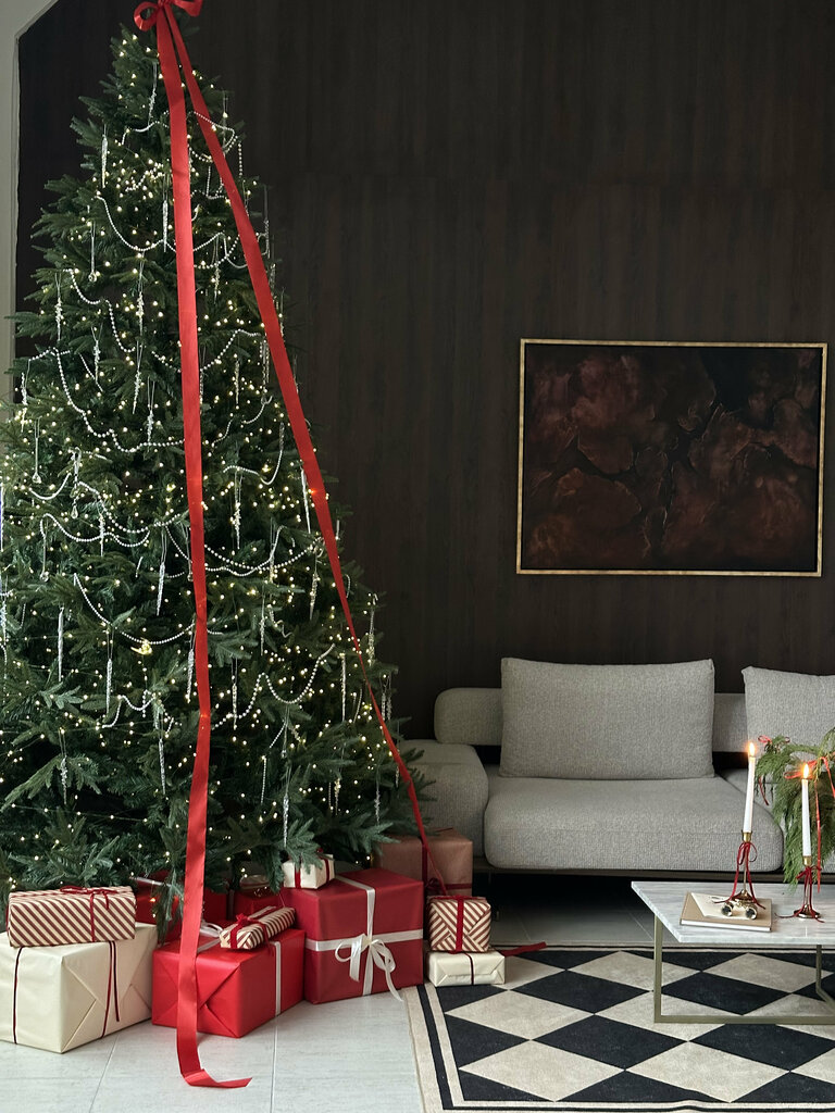 Площадь зала: 35 м² Зал Apart — уютный интерьер в стиле апартаментов. Светлые бежевые оттенки с чёрными деталями. Мебель в зале: • молочный диван • консоль с предметами декора • торшер • зеркало-арка • мраморный стол • кресло букле