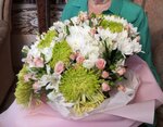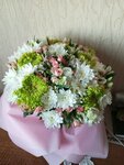 Данный букет осыпался через несколько часов и началась длительная переписка. Осыпались большие хризантемы, что отказывался принять поставщик. Обратите внимание на фото с женщиной это после вручения букета, он уже осыпался. Но спустя какое то время поставщик согласился на замену цветов . Ждём букет. Правда, это другие цветы, но праздник был подпорчен.
