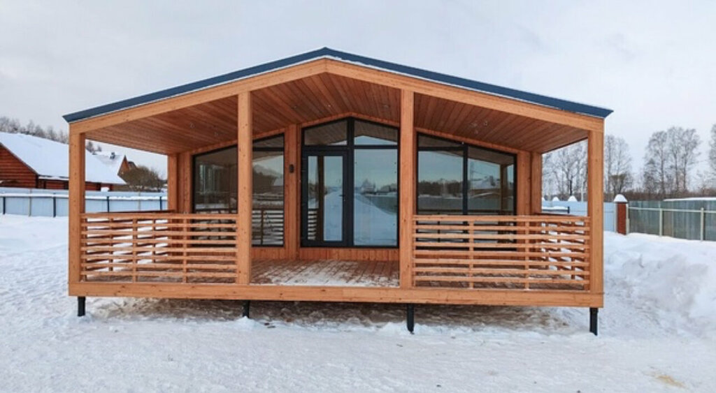 Модульный дом «Очаг 42» — стиль, комфорт и премиальное качество в каждой детали. 42 м² общей площади застройки, из которых 30 м² отапливаемого пространства + просторная веранда 12 м². Высота потолков до 2,65 м — ды
