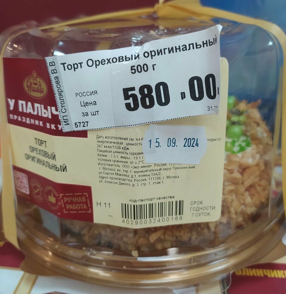Продают торты от Палыча с нарушениями сроков годности, используют свои, поддельные маркировки сроков годности, не установленного компанией У Палыча образца, по заниженным ценам. Будьте бдительны при покупке товаров у данного продавца, особенно когда покупаете продукцию на стол детям.