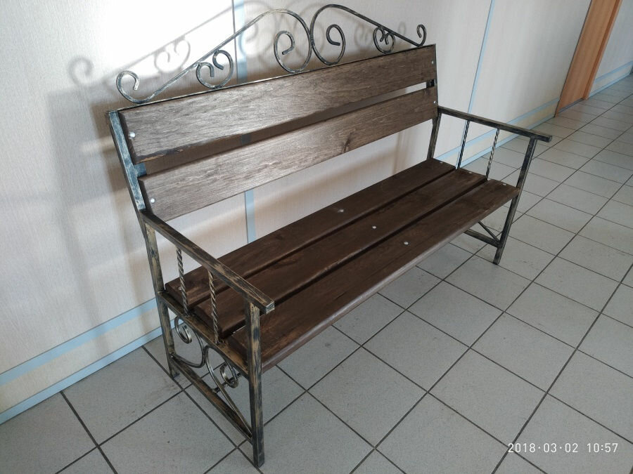 Применяемые материалы: Опоры: Сталь. Покрыты эмалью. Сиденье и спинка: Доска осина + Тонировочный состав с антисептиком "Здоровый Дом". Технические характеристики: Общая высота скамейки: 120 см. Общая ширина скамейки: 31 см. Общая длинна ск