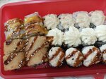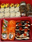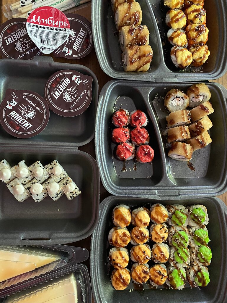 Variety of food:сhinese food, sushi and rolls, pizza