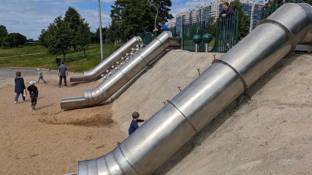 Очень странно, что около площадки стоит забор, то ли его просто не убрали, то ли площадку не доделали... Но все тут играют, уже есть погрешности, за которыми никто не следит, площадка для взрослых, малыши тоже хотят на горки, но залазить не удобно и все время огромные дети норовят обогнать. Нижний ярус тоже не до конца продуман и есть нюансы... А в целом интересно, но не до конца продумано.