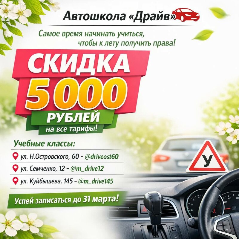 🔥 Права к лету - реально! Сейчас самое время начать обучение в автошколе «Драйв» 💸 Скидка 5 000 рублей от стоимости всех тарифов до 31 ма...