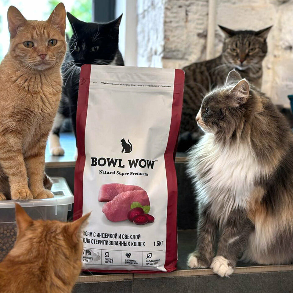 Улучшенная формула: еще больше животного белка и полезных ингредиентов! Полнорационный корм BOWL WOW с индейкой, курицей и свеклой предназначен для кошек, здоровье которых требует особенно внимательного отношения.