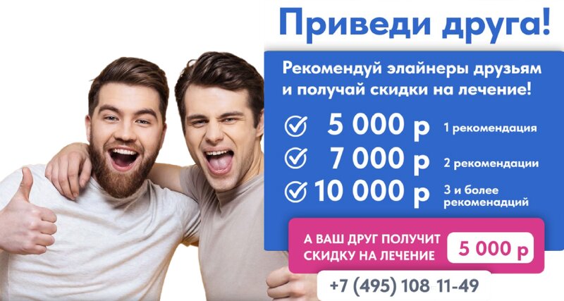 Акция приведи друга! Рекомендуй элайнеры друзьям и получай скидки на свое лечение! За 1 рекомендацию 5 000 рублей, За 2 рекомендации 7 000...