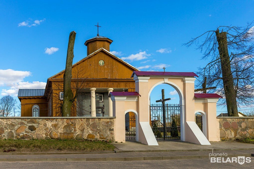 The Church of the Finding of the Holy Cross. It was built of wood in 1788-89 by the foundation of Prince Stanislav Radziwill and his wife Karolina, designed by architect John Padchashinsky. There was a parish school and a hospital attached to the church. In architecture, it is an example of folk architecture with features of classicism. The temple was active all the time and was not closed even under Soviet rule. There are 4 altars inside. The main and two side panels form a single composition. On the left, in the chapel of the transept, there is an altar with an icon of the Mother of God, revered as miraculous. It has been preserved since the last church.