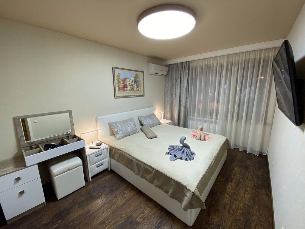 Отличные аппарты! Новый ремонт, удобные кровати, каждая комната с ТВ и кондеем. Как рекомендация хозяевам добавить бытовую мелочевку: бумагу тубзиковую, пасту зубную, для стиралки химозу и дрррр. для комфортного проживания в прекрасных аппартаментах.
