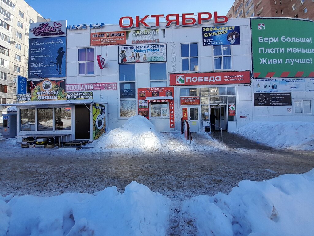 Широкий выбор товаров, чисто, вежливое обслуживание. Цены приемлемые. Много постоянных покупателей, несмотря на близость Победы.